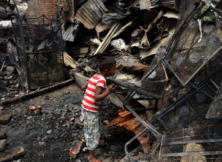 6月7日,一名兒童在孟加拉國首都達(dá)卡發(fā)生火災(zāi)的貧民窟廢墟中尋找個人物品。