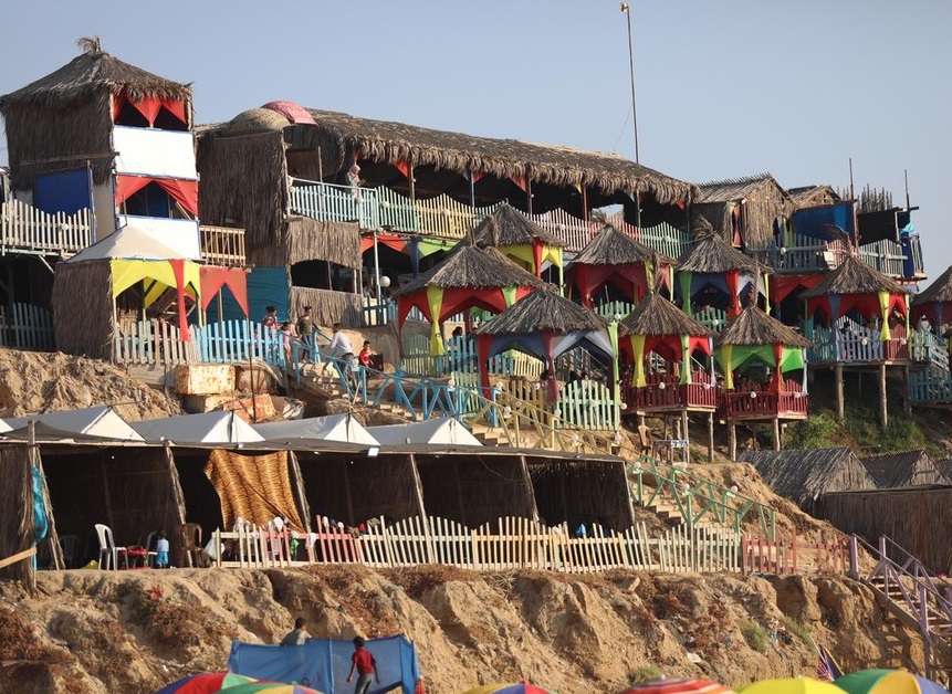 人民網(wǎng)訊 當?shù)貢r間2021年6月25日,巴勒斯坦Deir al-Balah,當?shù)鼐用裥∧疚葜懈╊刂泻:?,樂享夏日時光。海灘是這個城市為數(shù)不多開放的公共空間之一。