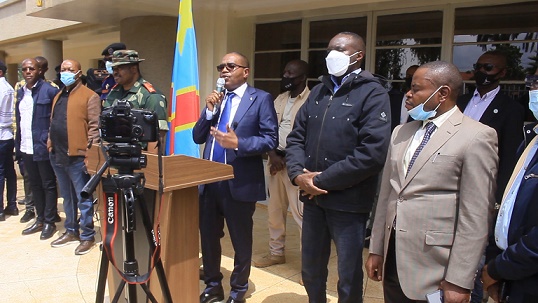 11月3日,剛果(金)南基伍省省長(zhǎng)卡西(中)在該省首府布卡武市就當(dāng)天凌晨發(fā)生的襲擊召開新聞發(fā)布會(huì)。