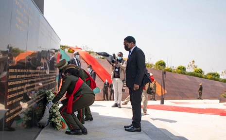 8月10日,在贊比亞盧薩卡省瓊圭地區(qū)的坦贊鐵路紀(jì)念園,贊比亞總統(tǒng)希奇萊馬(前右)向?yàn)樾藿ㄌ官濊F路等項(xiàng)目而犧牲的中方人員敬獻(xiàn)花圈。新華社發(fā)(中國土木工程集團(tuán)供圖)