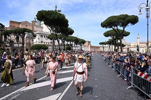 4月23日,人們穿戴古羅馬時(shí)期服飾,圍繞羅馬大競技場、威尼斯廣場和斗獸場等景點(diǎn)進(jìn)行建城2776年慶祝游行。相傳羅馬建城日為公元前753年4月21日。