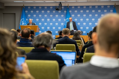 9日,在位于紐約的聯(lián)合國(guó)總部,古特雷斯在記者會(huì)上就巴以局勢(shì)發(fā)表談話。新華社發(fā)(聯(lián)合國(guó)供圖/保羅·菲爾蓋拉斯攝)