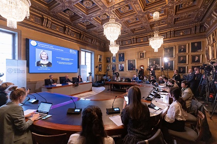 這是9日在瑞典斯德哥爾摩拍攝的2023年諾貝爾經(jīng)濟(jì)學(xué)獎(jiǎng)公布現(xiàn)場。新華社發(fā)(魏學(xué)超攝)