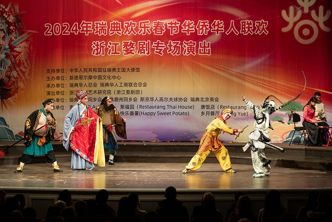 2月2日,瑞典斯德哥爾摩中國文化中心在斯德哥爾摩舉辦活動(dòng),通過美食、年畫、彩燈、舞龍和婺劇等多種形式,讓當(dāng)?shù)孛癖姾腿A僑華人享受了一場“歡樂春節(jié)”的文化大餐。這是演員在活動(dòng)中表演婺劇。新華社發(fā)(魏學(xué)超攝)