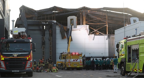 6月24日,救援人員在韓國京畿道華城市電池制造企業(yè)工廠火災(zāi)現(xiàn)場搜救。新華社記者 姚琪琳 攝