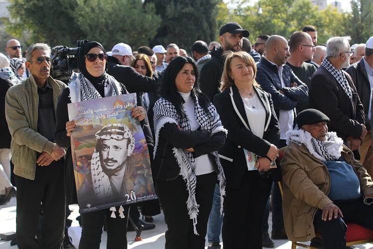 11月11日,在約旦河西岸城市拉姆安拉,民眾集會紀念巴勒斯坦前領導人阿拉法特逝世20周年。新華社發(fā)(尼達爾·艾仕塔耶攝)