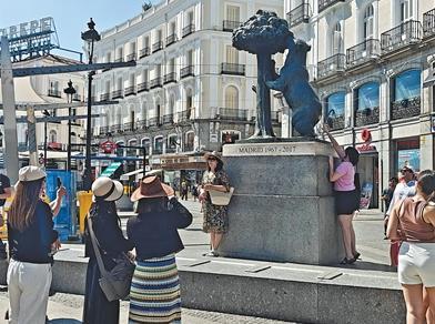 今年夏季,大批中國(guó)游客到訪西班牙馬德里。圖為近日,中國(guó)游客與馬德里標(biāo)志性雕塑——熊與樹莓合影。人民日?qǐng)?bào)記者 許海林?jǐn)z