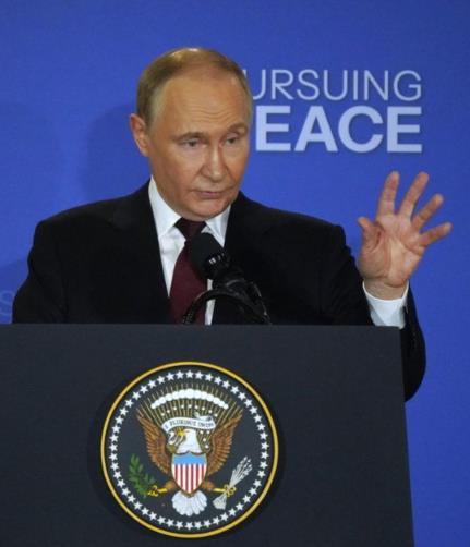 8月15日,俄羅斯總統(tǒng)普京與美國(guó)總統(tǒng)特朗普(未在畫(huà)面中)在美國(guó)阿拉斯加州安克雷奇市埃爾門(mén)多夫-理查森聯(lián)合軍事基地舉行會(huì)晤后共同出席聯(lián)合記者會(huì)。新華社記者吳曉凌攝