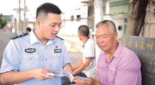 圖為施曉健進(jìn)村居對(duì)老人進(jìn)行反詐宣傳。 漳州市公安局龍文分局供圖