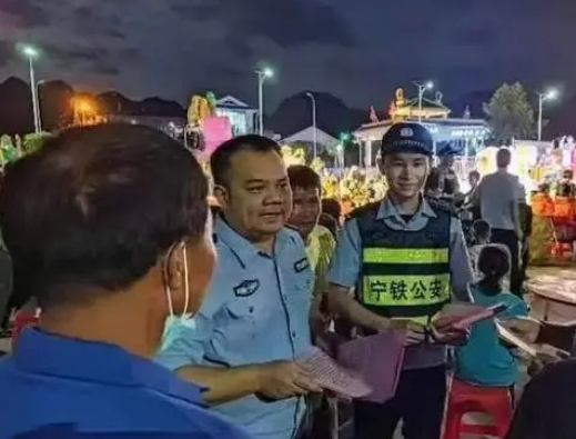 圖為2021年,永安派出所民警李燮(左二)聯(lián)合寧鐵公安在永安高鐵站進行安全防護宣傳。警方供圖