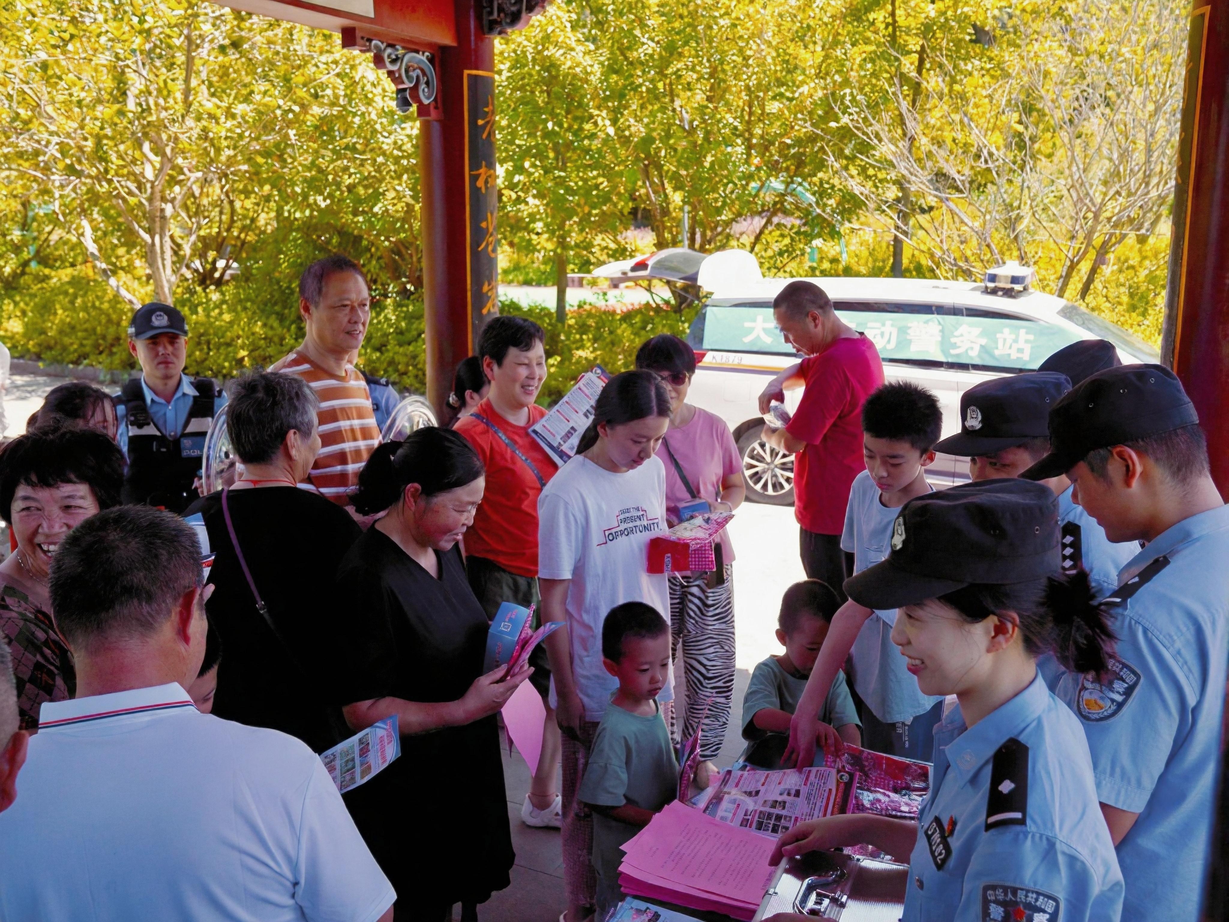 盛夏七月,海拔近千米的大洋鎮(zhèn)迎來避暑客流高峰。綠林中的大洋水庫旁新設的“警務涼亭”成了游客歇腳點。7月14日中午,民警張洵正向圍坐的游客遞上涼茶,普及反詐知識。