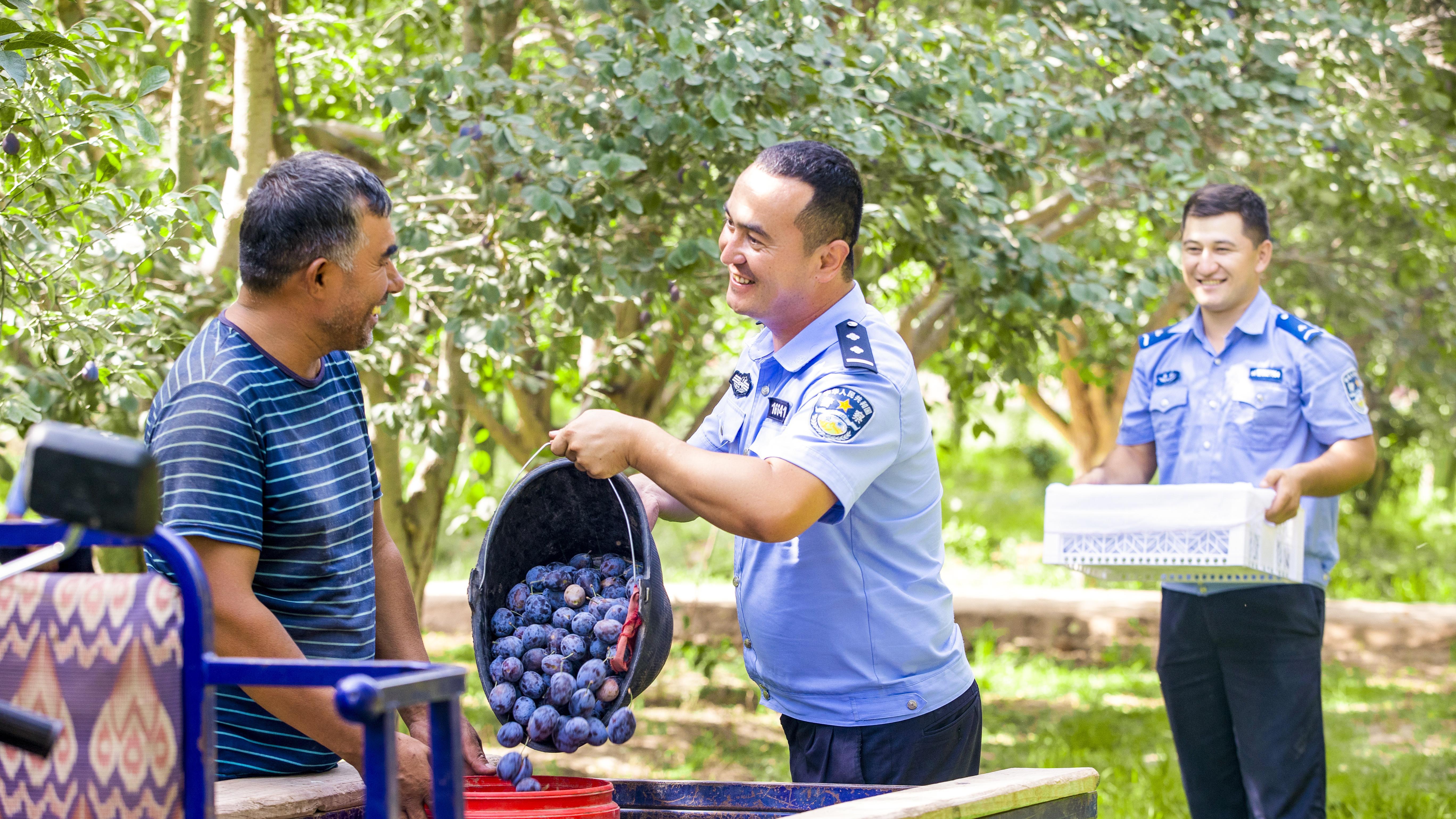 圖為伽師縣公安局英買里鎮(zhèn)派出所民輔警幫助果農(nóng)把剛采摘的新梅放到三輪車上。高坤 攝
