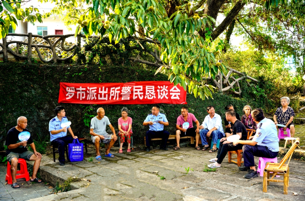 圖為奉新縣公安局羅市派出所民警在香樟樹下舉行警民懇談會。