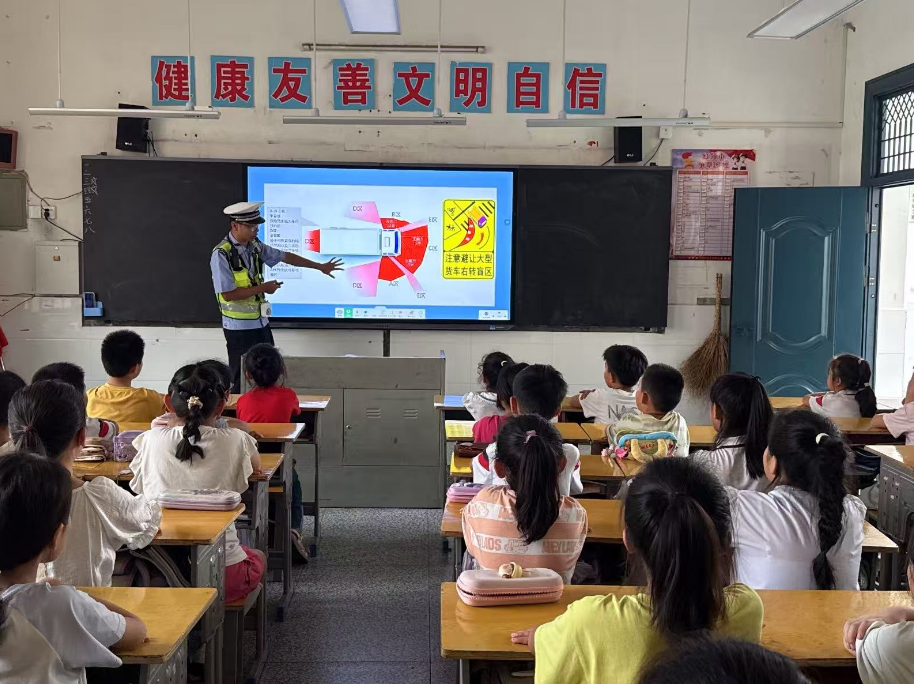 圖為9月8日,民警走進(jìn)廬山市第二中學(xué)為學(xué)生們講解如何避開汽車盲區(qū)。