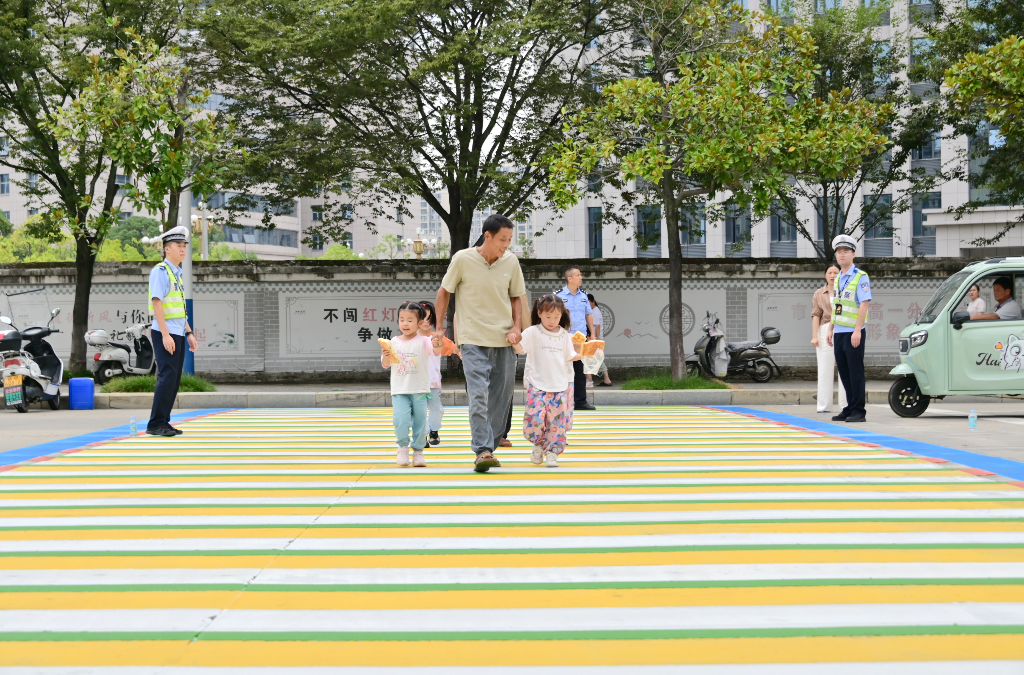 9月23日,由紅、黃、藍、綠、白五色噴涂構(gòu)建的3D立體多彩斑馬線,在江西省武寧縣多個校園門口及附近完成施劃作業(yè)并正式“亮相”街頭。