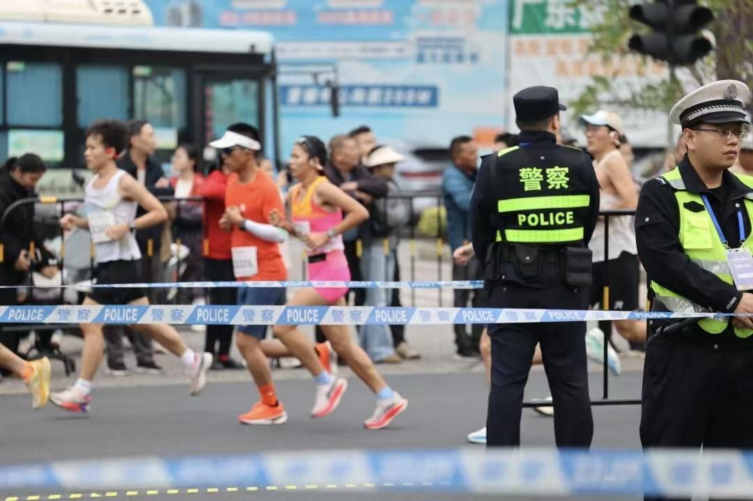 賽事過程中,民警們時刻關(guān)注選手狀態(tài),對突發(fā)抽筋、暈倒等情況的參賽選手第一時間實施緊急救助,以“溫情藍(lán)”守護每一位跑者的安全。
