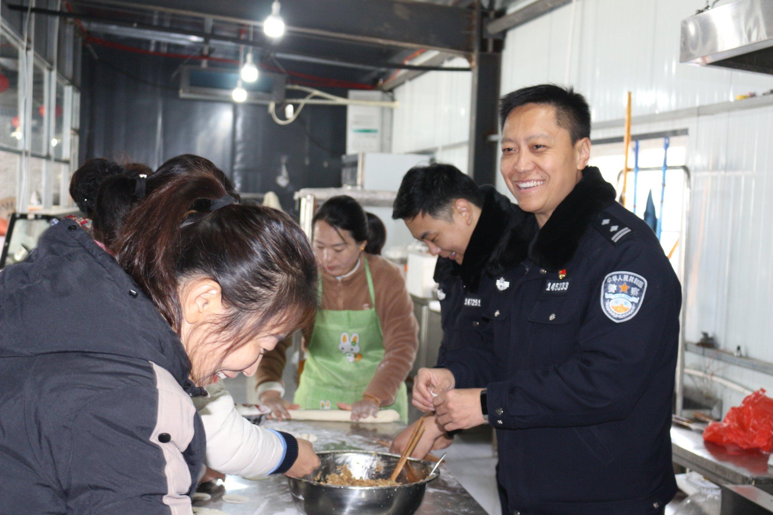 圖為民警與群眾一起包餃子。