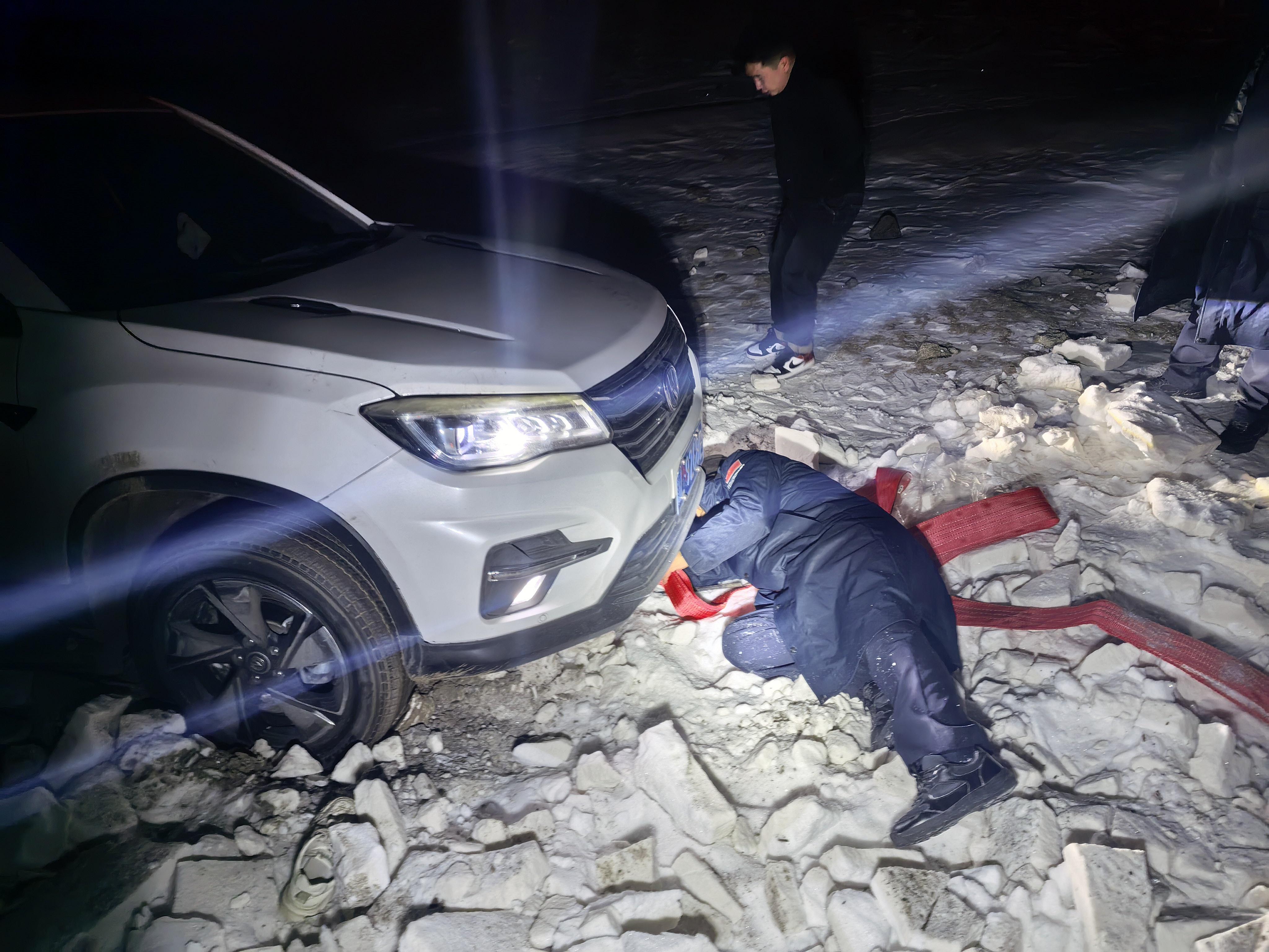 接警后,派出所立即啟動(dòng)應(yīng)急預(yù)案,4名民輔警攜帶鐵鍬、拖車(chē)?yán)K及應(yīng)急物資,駕駛警車(chē)火速趕往現(xiàn)場(chǎng)。鹽池鎮(zhèn)轄區(qū)山大溝深,通往冰川的道路積雪最深處達(dá)40厘米,路基被積雪完全覆蓋。救援路上,民警憑借豐富的巡邏經(jīng)驗(yàn),一邊安撫游客情緒,一邊指導(dǎo)其開(kāi)啟車(chē)燈作為信號(hào)。