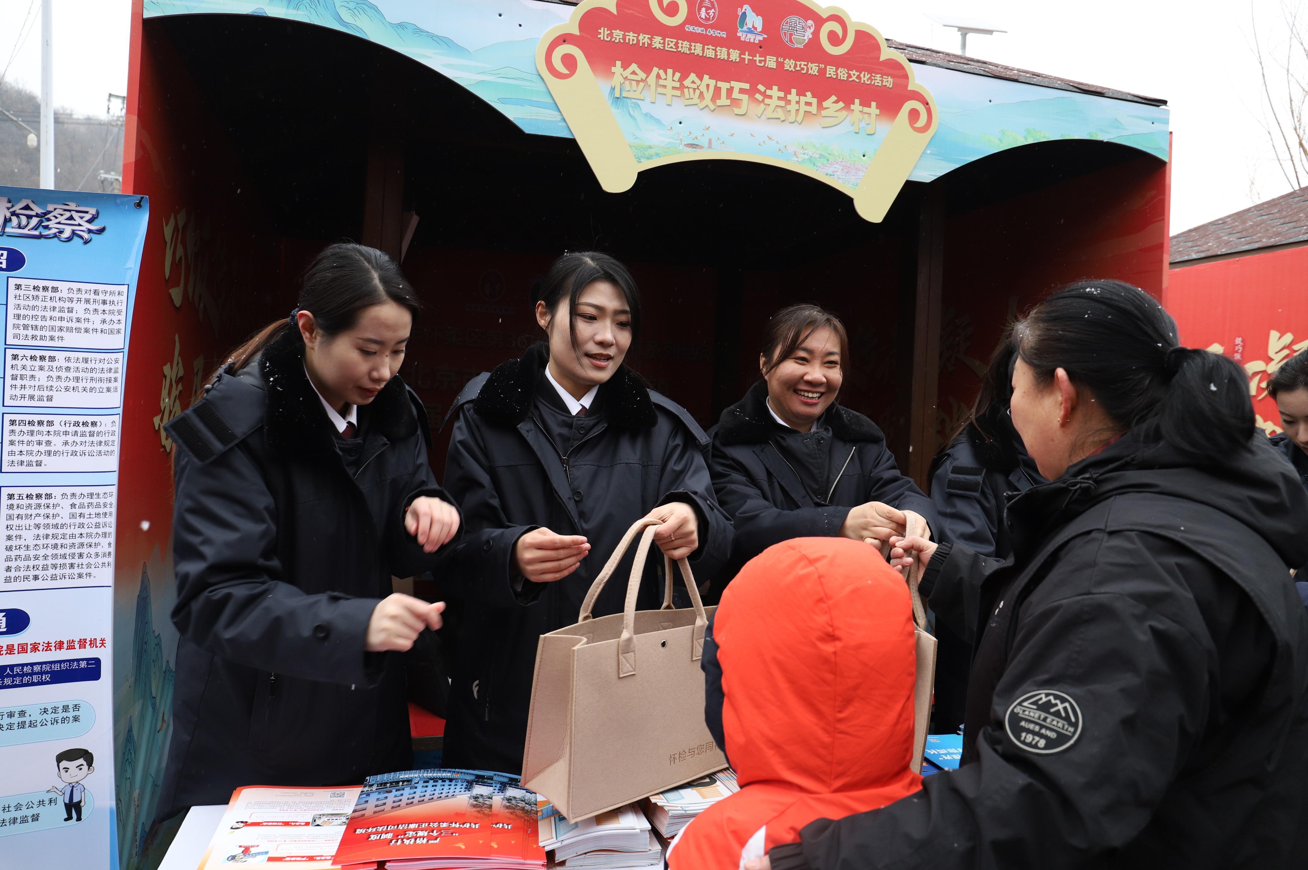 3月4日,在北京市懷柔區(qū)琉璃廟鎮(zhèn)第十七屆“斂巧飯”民俗文化活動現(xiàn)場,懷柔區(qū)人民檢察院以“非遺+法治”為主題開展法治宣傳,通過線上直播、線下互動、咨詢服務(wù)相結(jié)合,把法治課堂搬進民俗盛會。