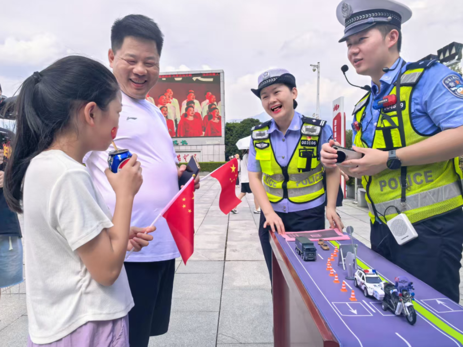 2025年國慶假期,來自湖南的游客王先生一家被“高速公路安全桌盤講解區(qū)”吸引,民警用沙盤模擬高速爆胎、發(fā)生事故等場(chǎng)景,手把手教他如何正確放置三角警示牌?!霸疽蚨萝囆那楹軣┰辏瑳]想到還能學(xué)到安全技能,井岡山的高速交警太有心了?!蓖跸壬B連稱贊。