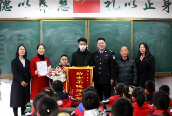 “拾金不昧好少年!”日前,四川資陽市雁江七小,失主吳先生和民警送來錦旗和《表揚信》,希望學(xué)校公開表揚該校四年級學(xué)生鐘一瑁,讓更多孩子向他學(xué)習(xí),一樣拾金不昧。