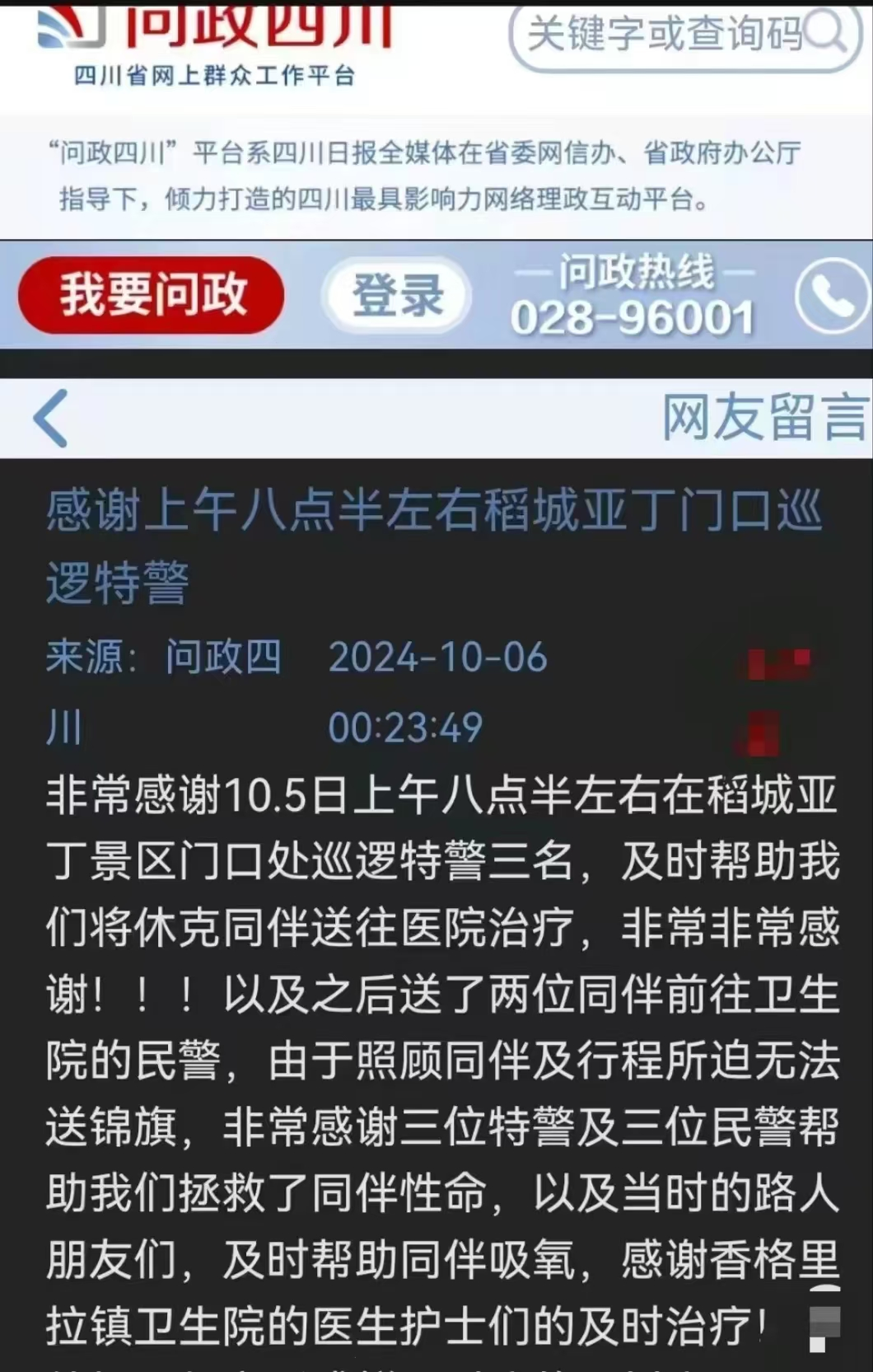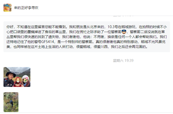 “你好,不知道在這里留言您能不能看到。我和朋友是從北京來的,10月3號日在稻城游玩,在拍照的時候不小心把口袋里的墨鏡掉進了身后的草叢里,我們在慌忙之際求助了一位警察哥,警察哥二話沒說就在草叢里幫我們很快速的找到了遺失物,我們謝謝他,他說:不用謝,換做是任何一個人都會幫助我們。我們還特地記住了他的警號GF5414,是一個特別帥的警察哥。真的很謝謝他真的特別感動,稻城不光風(fēng)景優(yōu)美,也同樣被在這片土地上生活的人所打動,很愛稻城,很愛川西,我們之后還會再見面的?!?/p>