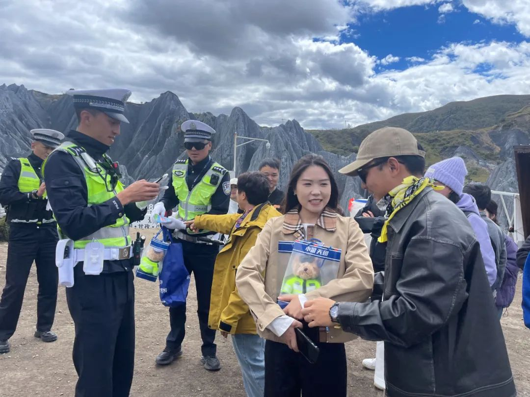 10月1日,在國慶“黃金周”首日,道孚縣八美鎮(zhèn)墨石公園景區(qū)迎來了第一批打卡的游客。道孚縣公安局交警大隊也為遠道而來的客人們,準(zhǔn)備了一份精美的小禮品,包含“交警小熊”“水杯”“雨傘”等,游客們只需要回答交警現(xiàn)場開展的“假期平安行·交通安全知識競賽”,答對題目就能帶著禮品繼續(xù)環(huán)游甘孜。