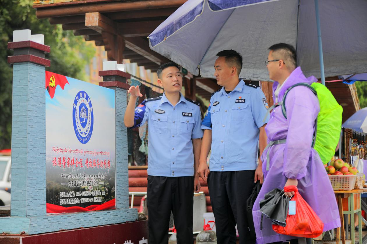 旅游警務小分隊最核心的服務,就是服務游客,他們樂此不疲,推行了“背包警務”,如同“背包俠”零距離服務在游客身邊?!熬瘎毡嘲崩锩媾鋫淞酸t(yī)療急救包、氧氣瓶、抗高反藥品、車輛應急工具,以及丹巴縣旅游指南,還有民警工作筆記本,最大限度地,做到“安心護游客、溫心暖游客、貼心寵游客”。去年8月,有一個武漢“夕陽紅團”從阿壩州四姑娘山過來,因連續(xù)幾天奔波,天氣炎熱,到甲居藏寨下車就有3人出現(xiàn)高反,執(zhí)勤民警從“警務背包”拿出氧氣瓶與紅景天,第一時間讓老人緩解了高反。今年8月18日,陜西周先生與朋友帶著家人自駕旅游,到景區(qū)后,前車胎爆,民警打開“警務背包”拿出工具,立即幫助換胎。