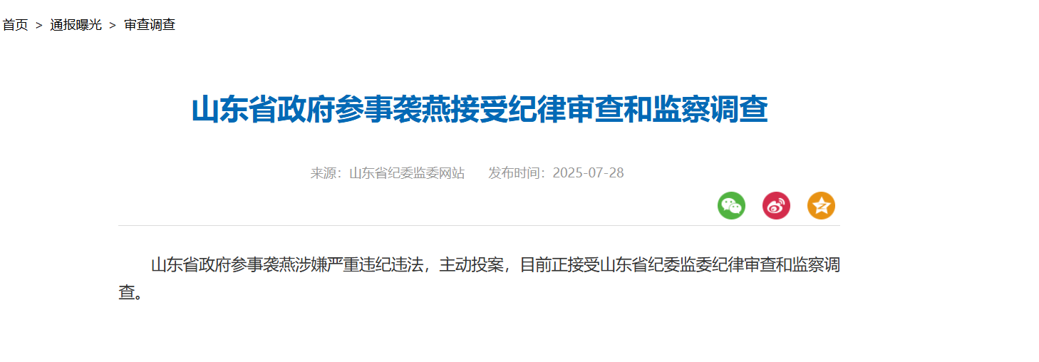 7月28日,據(jù)山東省紀委監(jiān)委網(wǎng)站消息,山東省政府參事襲燕涉嫌嚴重違紀違法,主動投案,目前正接受山東省紀委監(jiān)委紀律審查和監(jiān)察調(diào)查。