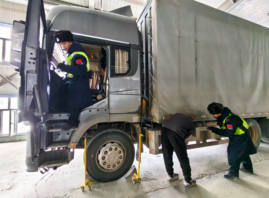 圖為執(zhí)勤民警查驗(yàn)出境貨車。
