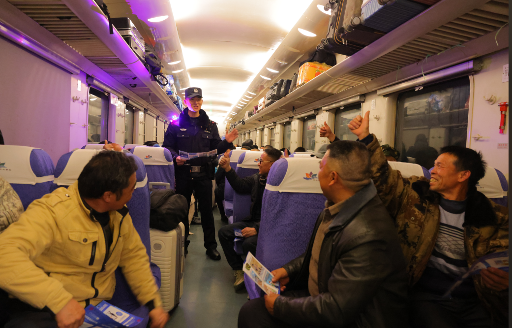 為確保該趟列車平安運行,庫爾勒鐵路公安處乘警支隊以“開車后反電詐宣傳、熄燈前人身安全提醒、熄燈后巡視震懾、到站前財物安全提示”的閉環(huán)舉措,構(gòu)建了“乘警+列車長+檢車”的三級聯(lián)防體系,讓平安氛圍充盈車廂。