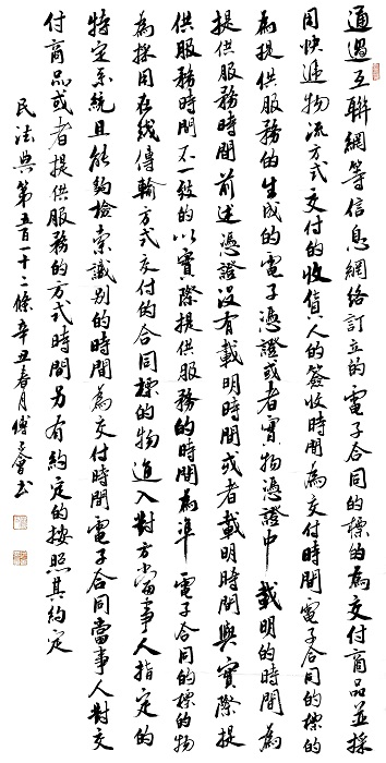 民法典第五百一十二條 通過互聯(lián)網(wǎng)等信息網(wǎng)絡(luò)訂立的電子合同的標(biāo)的為交付商品并采用快遞物流方式交付的,收貨人的簽收時間為交付時間。電子合同的標(biāo)的為提供服務(wù)的,生成的電子憑證或者實(shí)物憑證中載明的時間為提供服務(wù)時間;前述憑證沒有載明時間或者載明時間與實(shí)際提供服務(wù)時間不一致的,以實(shí)際提供服務(wù)的時間為準(zhǔn)。