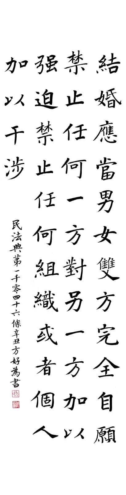 民法典第一千零四十六條 結(jié)婚應(yīng)當(dāng)男女雙方完全自愿,禁止任何一方對另一方加以強迫,禁止任何組織或者個人加以干涉。