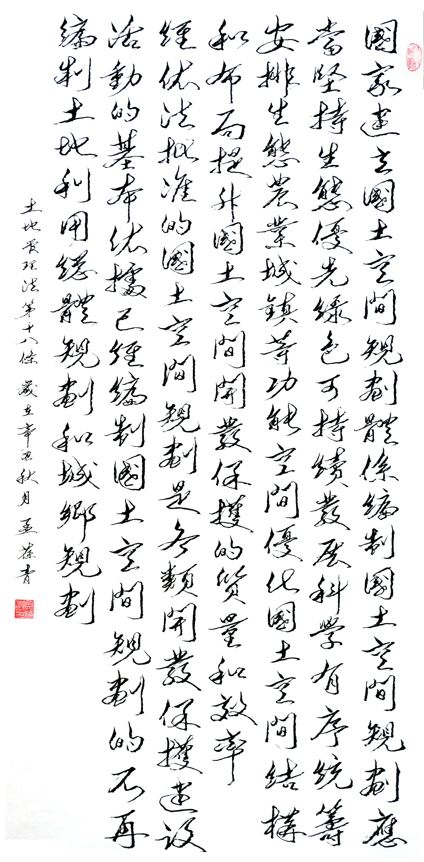 繼1600余位書法家參與書寫《中華人民共和國民法典》全部1260條法條之后,法治日報社聯(lián)合自然資源部法規(guī)司、自然資源部書畫研究會和北京昌平書法家協(xié)會,將筆端對準土地管理“一法一條例”,即《中華人民共和國土地管理法》和《中華人民共和國土地管理法實施條例》。