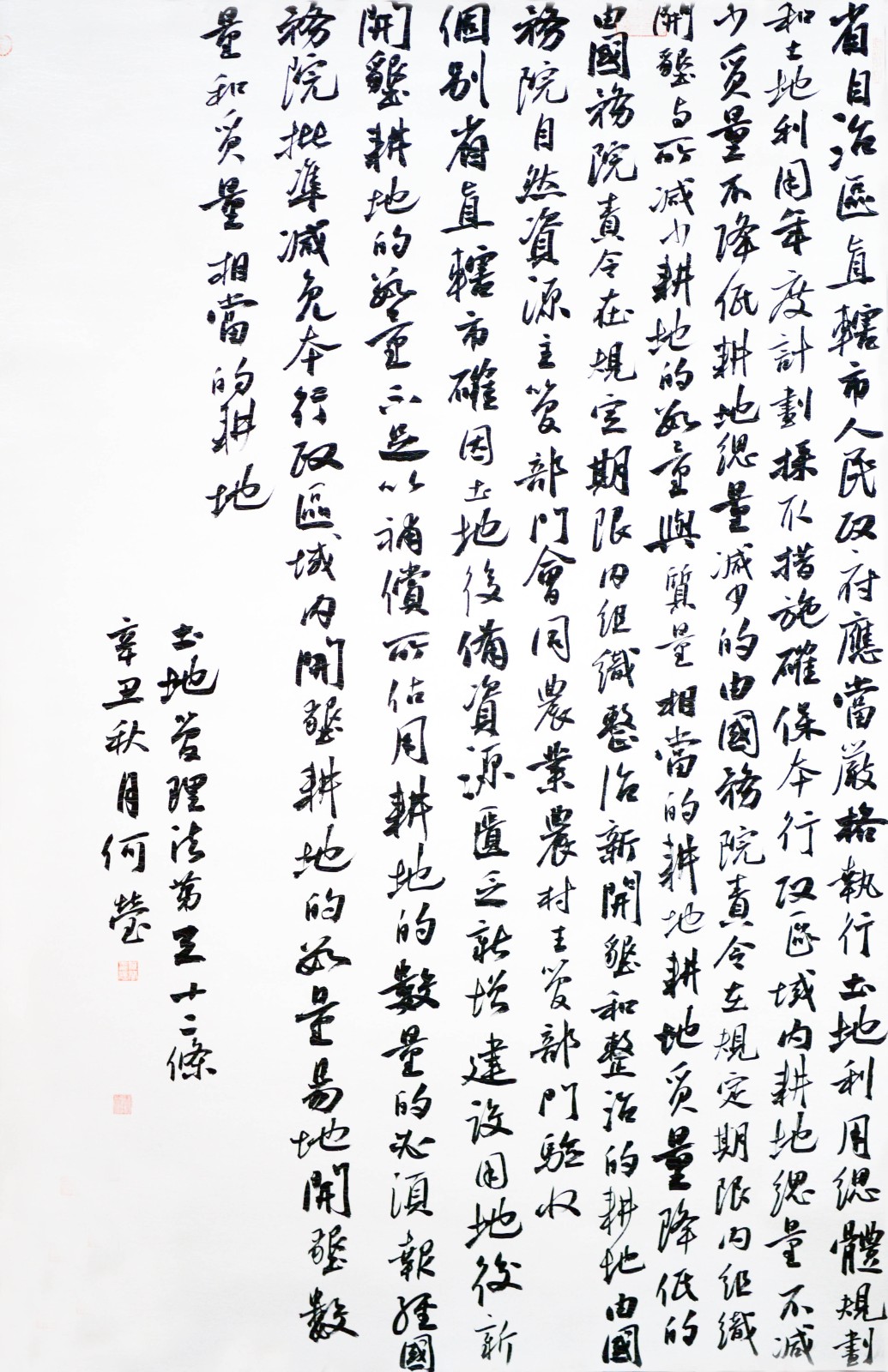 繼1600余位書法家參與書寫《中華人民共和國(guó)民法典》全部1260條法條之后,法治日?qǐng)?bào)社聯(lián)合自然資源部法規(guī)司、自然資源部書畫研究會(huì)和北京昌平書法家協(xié)會(huì),將筆端對(duì)準(zhǔn)土地管理“一法一條例”,即《中華人民共和國(guó)土地管理法》和《中華人民共和國(guó)土地管理法實(shí)施條例》。