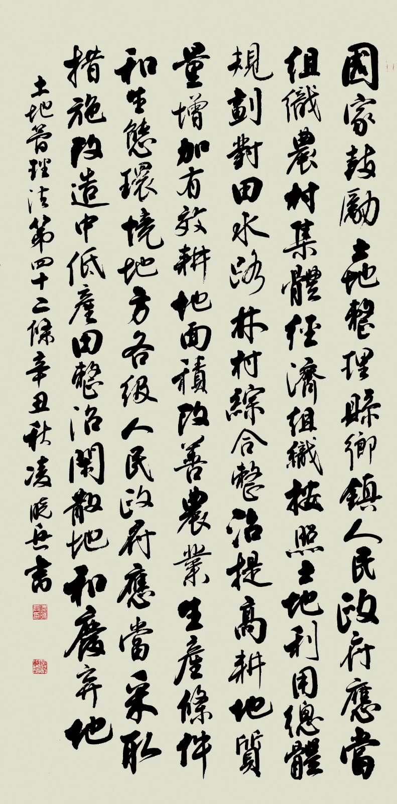 繼1600余位書法家參與書寫《中華人民共和國(guó)民法典》全部1260條法條之后,法治日?qǐng)?bào)社聯(lián)合自然資源部法規(guī)司、自然資源部書畫研究會(huì)和北京昌平書法家協(xié)會(huì),將筆端對(duì)準(zhǔn)土地管理“一法一條例”,即《中華人民共和國(guó)土地管理法》和《中華人民共和國(guó)土地管理法實(shí)施條例》。