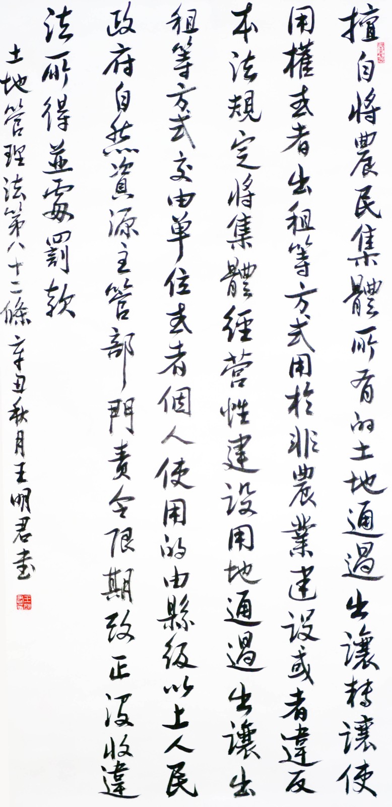 繼1600余位書(shū)法家參與書(shū)寫《中華人民共和國(guó)民法典》全部1260條法條之后,法治日?qǐng)?bào)社聯(lián)合自然資源部法規(guī)司、自然資源部書(shū)畫(huà)研究會(huì)和北京昌平書(shū)法家協(xié)會(huì),將筆端對(duì)準(zhǔn)土地管理“一法一條例”,即《中華人民共和國(guó)土地管理法》和《中華人民共和國(guó)土地管理法實(shí)施條例》。