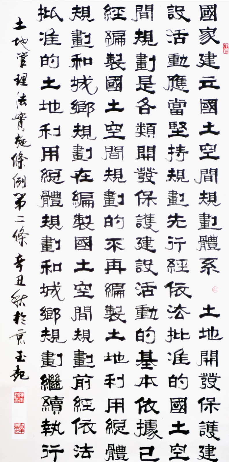 繼1600余位書法家參與書寫《中華人民共和國民法典》全部1260條法條之后,法治日報(bào)社聯(lián)合自然資源部法規(guī)司、自然資源部書畫研究會(huì)和北京昌平書法家協(xié)會(huì),將筆端對準(zhǔn)土地管理“一法一條例”,即《中華人民共和國土地管理法》和《中華人民共和國土地管理法實(shí)施條例》。