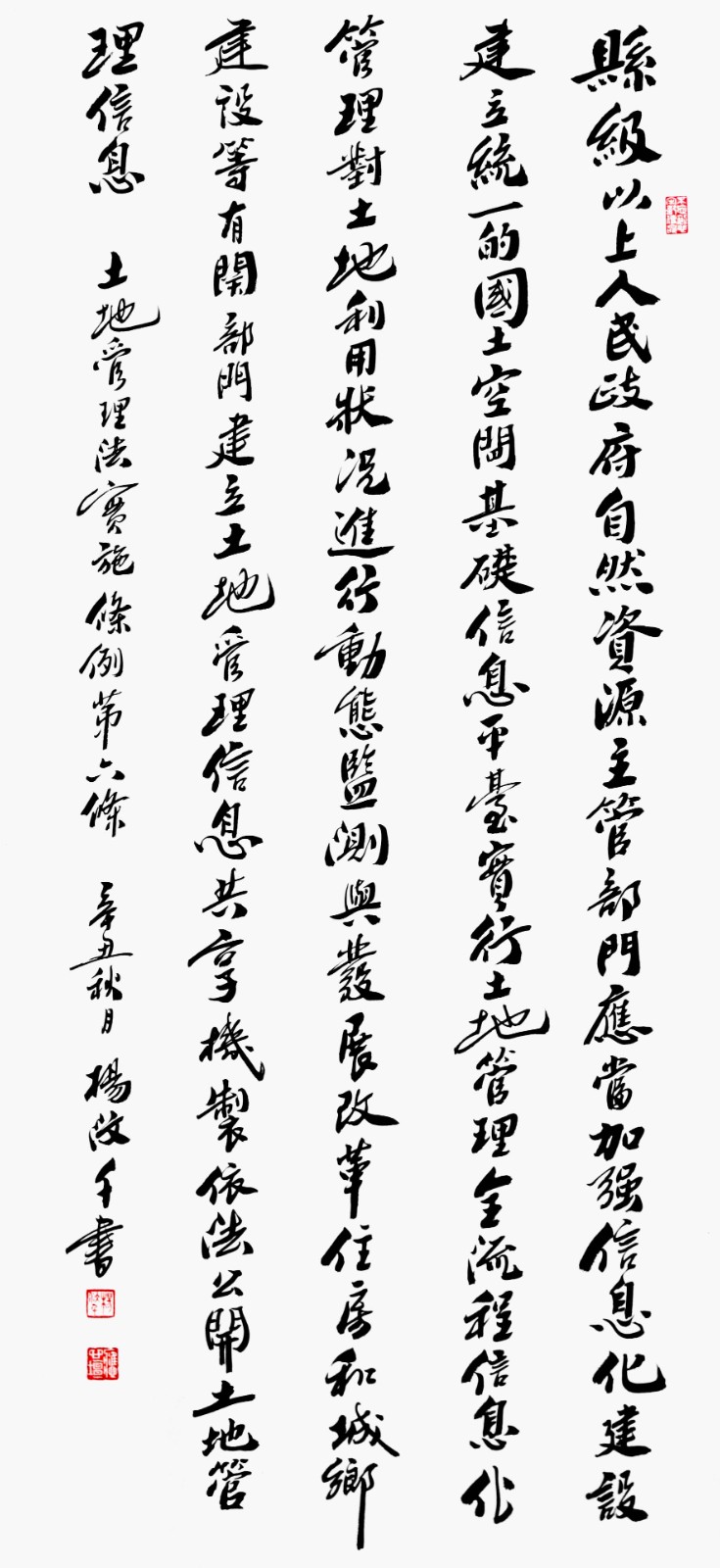 繼1600余位書法家參與書寫《中華人民共和國民法典》全部1260條法條之后,法治日報(bào)社聯(lián)合自然資源部法規(guī)司、自然資源部書畫研究會和北京昌平書法家協(xié)會,將筆端對準(zhǔn)土地管理“一法一條例”,即《中華人民共和國土地管理法》和《中華人民共和國土地管理法實(shí)施條例》。