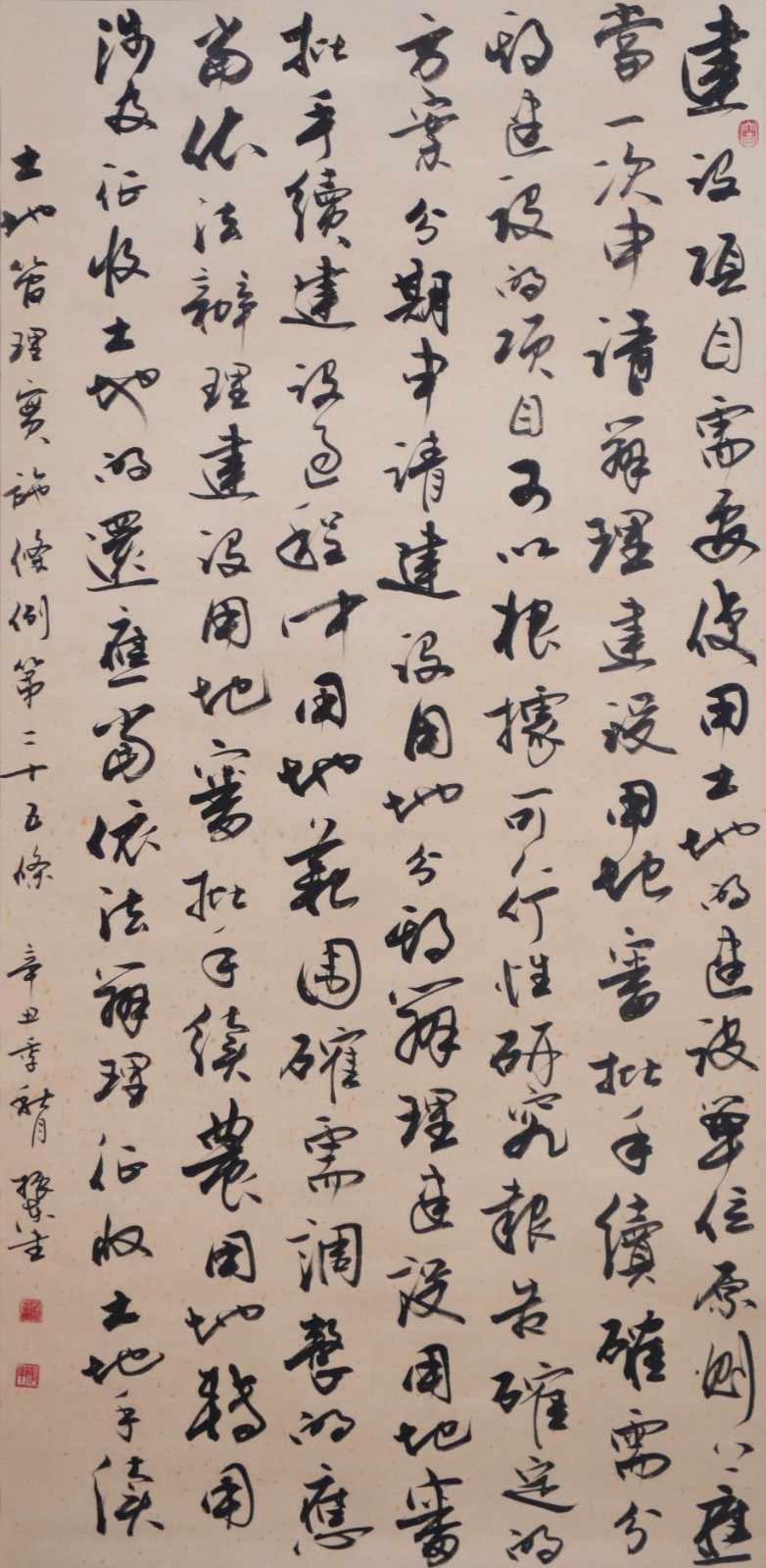 繼1600余位書法家參與書寫《中華人民共和國民法典》全部1260條法條之后,法治日報社聯(lián)合自然資源部法規(guī)司、自然資源部書畫研究會和北京昌平書法家協(xié)會,將筆端對準土地管理“一法一條例”,即《中華人民共和國土地管理法》和《中華人民共和國土地管理法實施條例》。