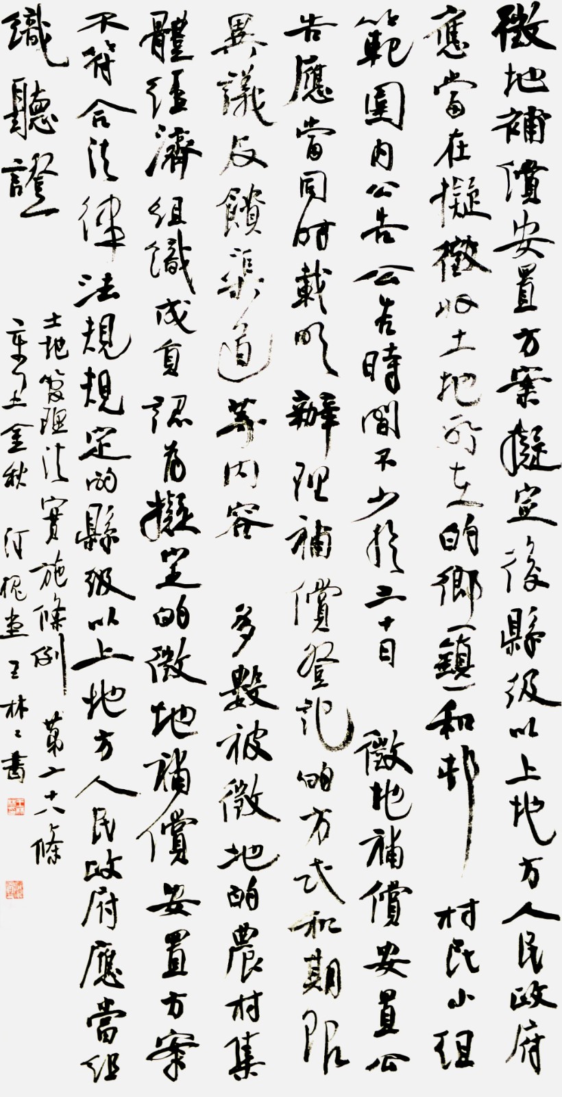 繼1600余位書法家參與書寫《中華人民共和國民法典》全部1260條法條之后,法治日報社聯(lián)合自然資源部法規(guī)司、自然資源部書畫研究會和北京昌平書法家協(xié)會,將筆端對準土地管理“一法一條例”,即《中華人民共和國土地管理法》和《中華人民共和國土地管理法實施條例》。