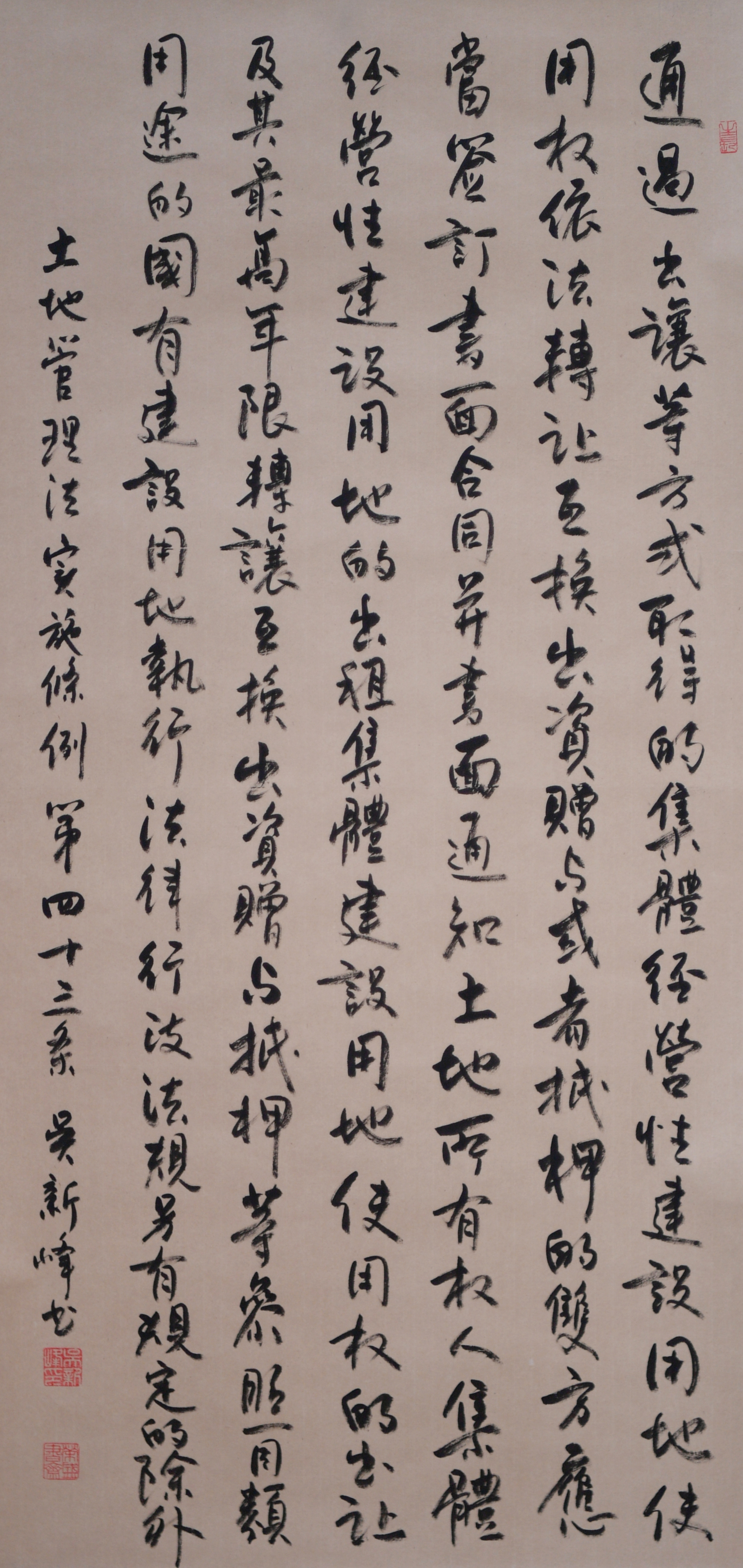 繼1600余位書法家參與書寫《中華人民共和國民法典》全部1260條法條之后,法治日?qǐng)?bào)社聯(lián)合自然資源部法規(guī)司、自然資源部書畫研究會(huì)和北京昌平書法家協(xié)會(huì),將筆端對(duì)準(zhǔn)土地管理“一法一條例”,即《中華人民共和國土地管理法》和《中華人民共和國土地管理法實(shí)施條例》。