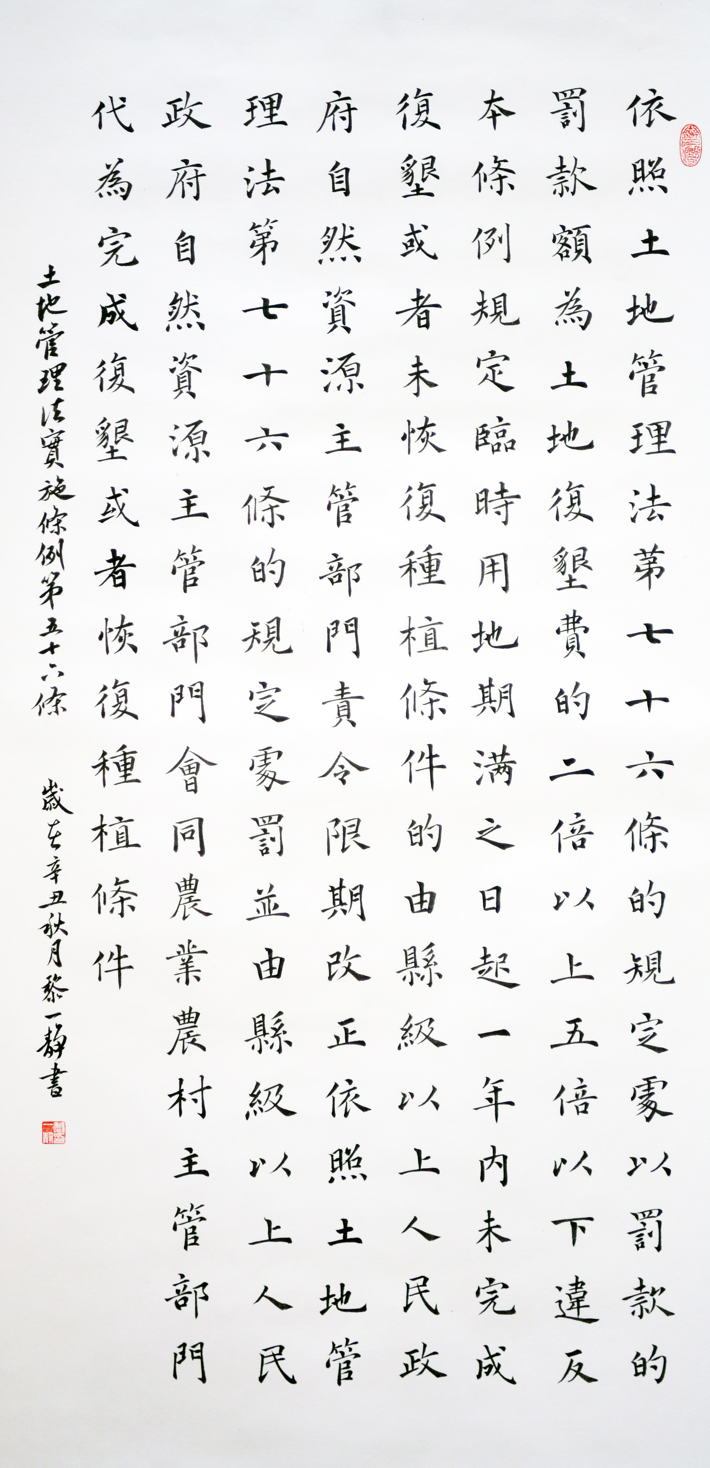 繼1600余位書法家參與書寫《中華人民共和國民法典》全部1260條法條之后,法治日報社聯(lián)合自然資源部法規(guī)司、自然資源部書畫研究會和北京昌平書法家協(xié)會,將筆端對準土地管理“一法一條例”,即《中華人民共和國土地管理法》和《中華人民共和國土地管理法實施條例》。