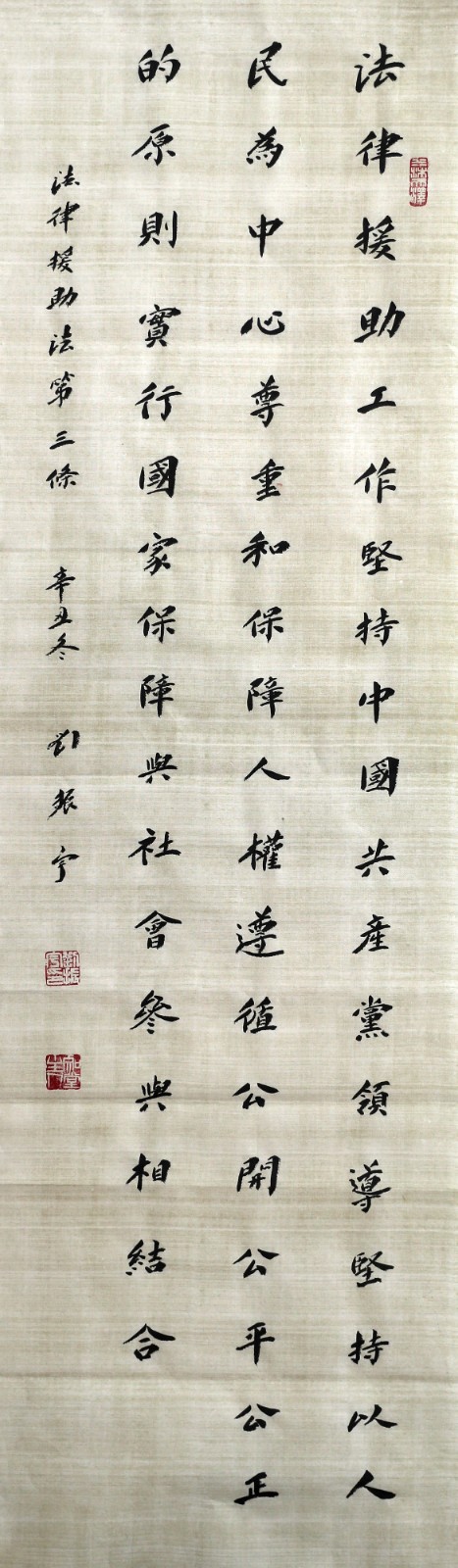 法律援助法第三條 法律援助工作堅(jiān)持中國(guó)共產(chǎn)黨領(lǐng)導(dǎo),堅(jiān)持以人民為中心,尊重和保障人權(quán),遵循公開、公平、公正的原則,實(shí)行國(guó)家保障與社會(huì)參與相結(jié)合。