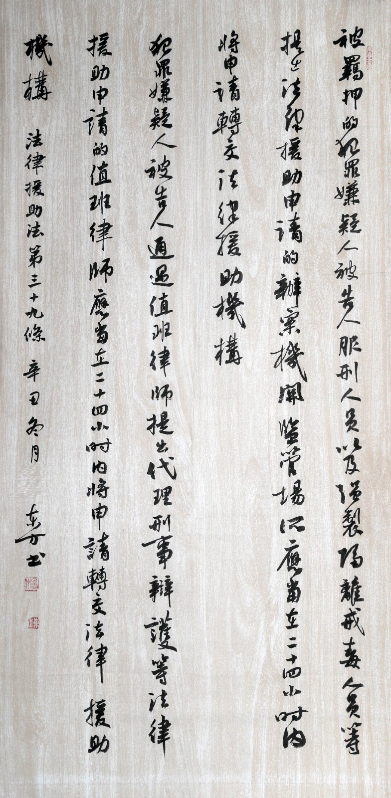 法律援助法第三十九條 被羈押的犯罪嫌疑人、被告人、服刑人員,以及強(qiáng)制隔離戒毒人員等提出法律援助申請的,辦案機(jī)關(guān)、監(jiān)管場所應(yīng)當(dāng)在二十四小時內(nèi)將申請轉(zhuǎn)交法律援助機(jī)構(gòu)。