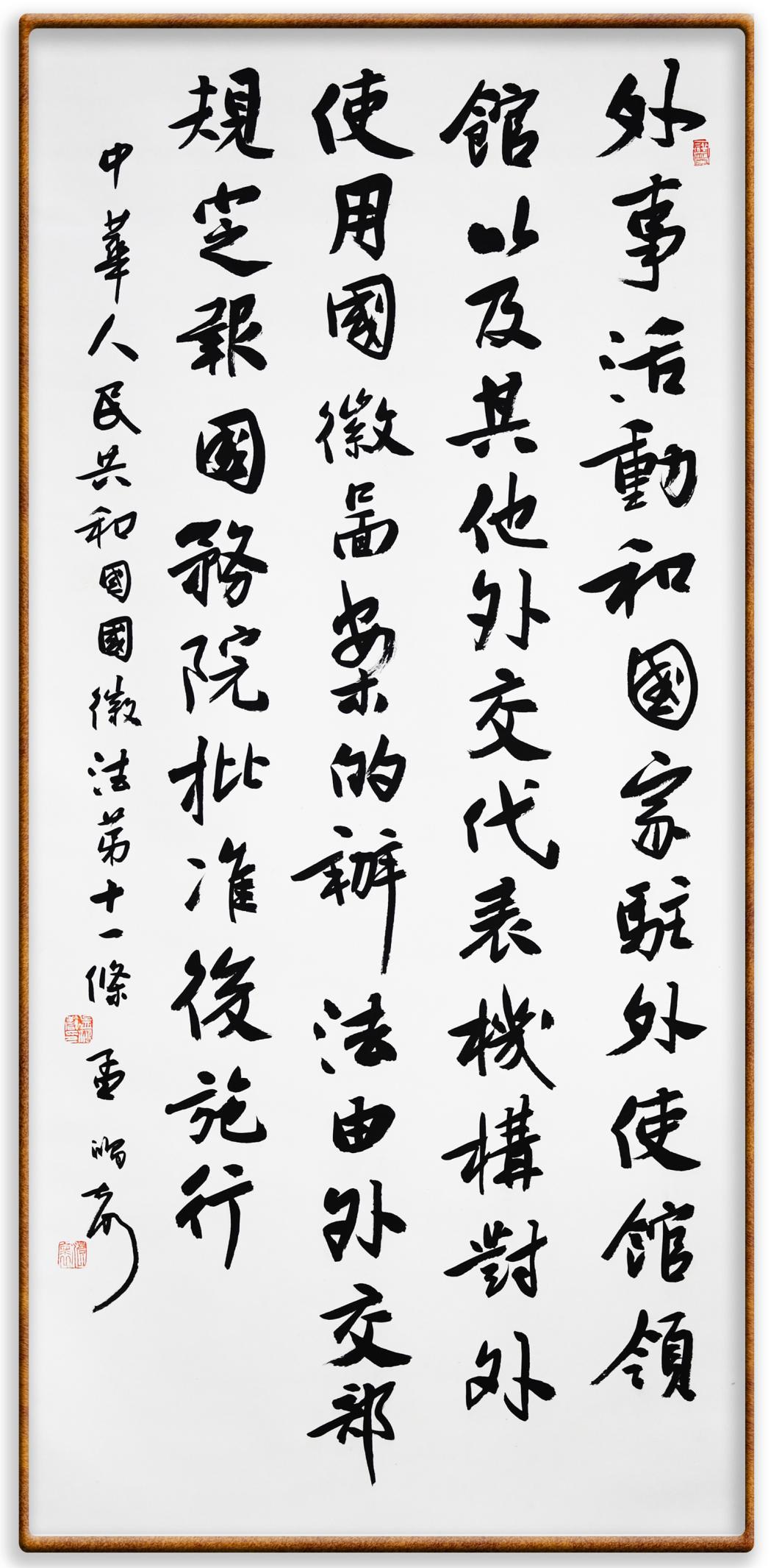 國徽法第十一條 外事活動和國家駐外使館、領(lǐng)館以及其他外交代表機(jī)構(gòu)對外使用國徽圖案的辦法,由外交部規(guī)定,報(bào)國務(wù)院批準(zhǔn)后施行。