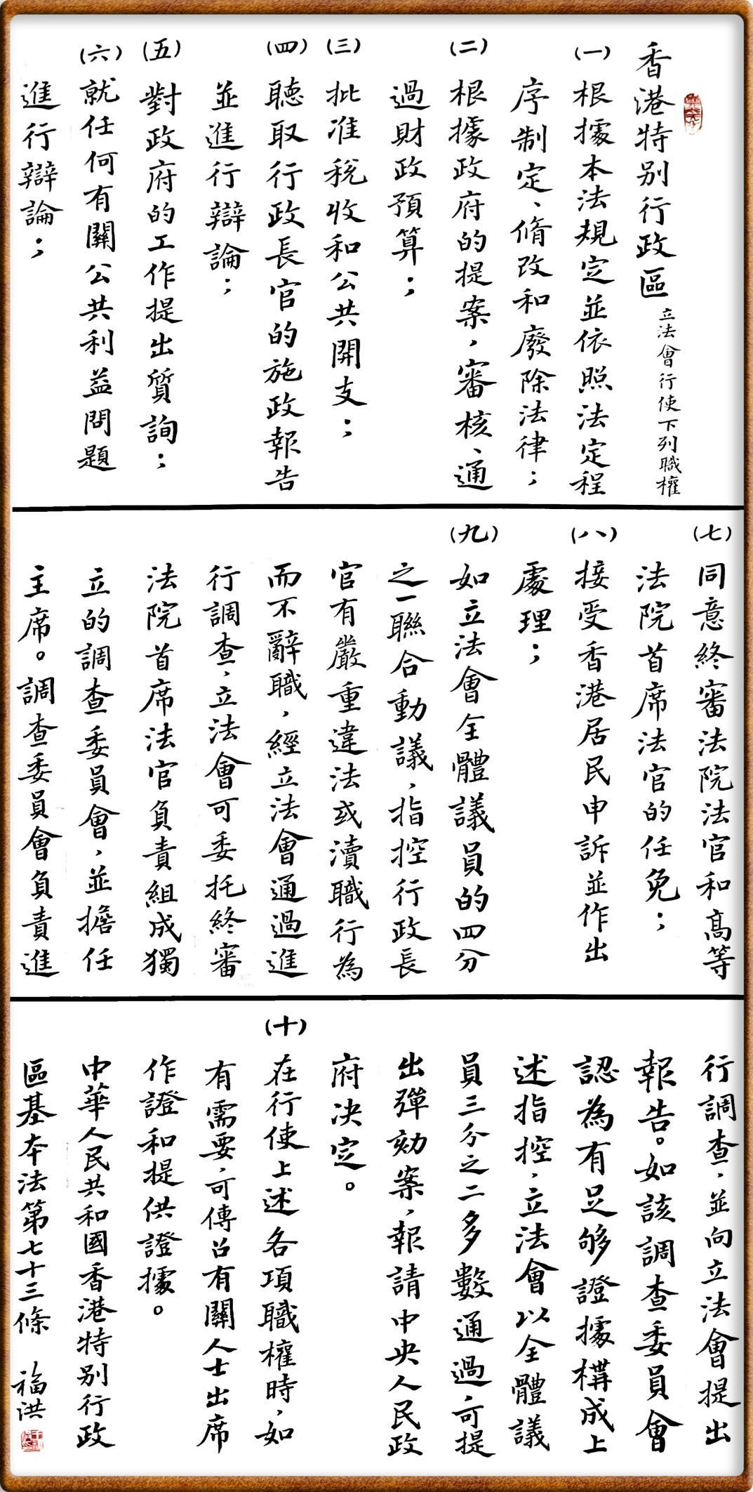 香港基本法第七十三條 香港特別行政區(qū)立法會行使下列職權: