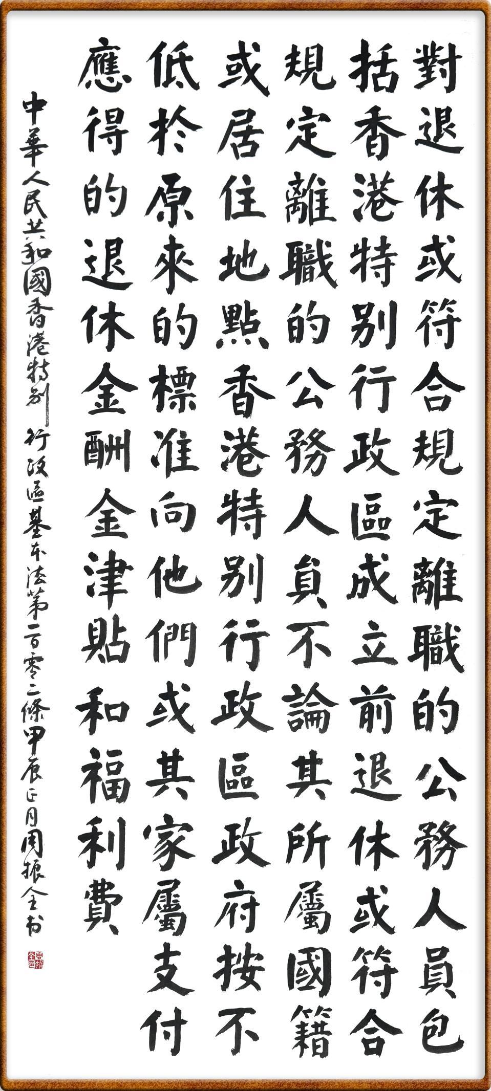 香港基本法第一百零二條 對(duì)退休或符合規(guī)定離職的公務(wù)人員,包括香港特別行政區(qū)成立前退休或符合規(guī)定離職的公務(wù)人員,不論其所屬?lài)?guó)籍或居住地點(diǎn),香港特別行政區(qū)政府按不低于原來(lái)的標(biāo)準(zhǔn)向他們或其家屬支付應(yīng)得的退休金、酬金、津貼和福利費(fèi)。