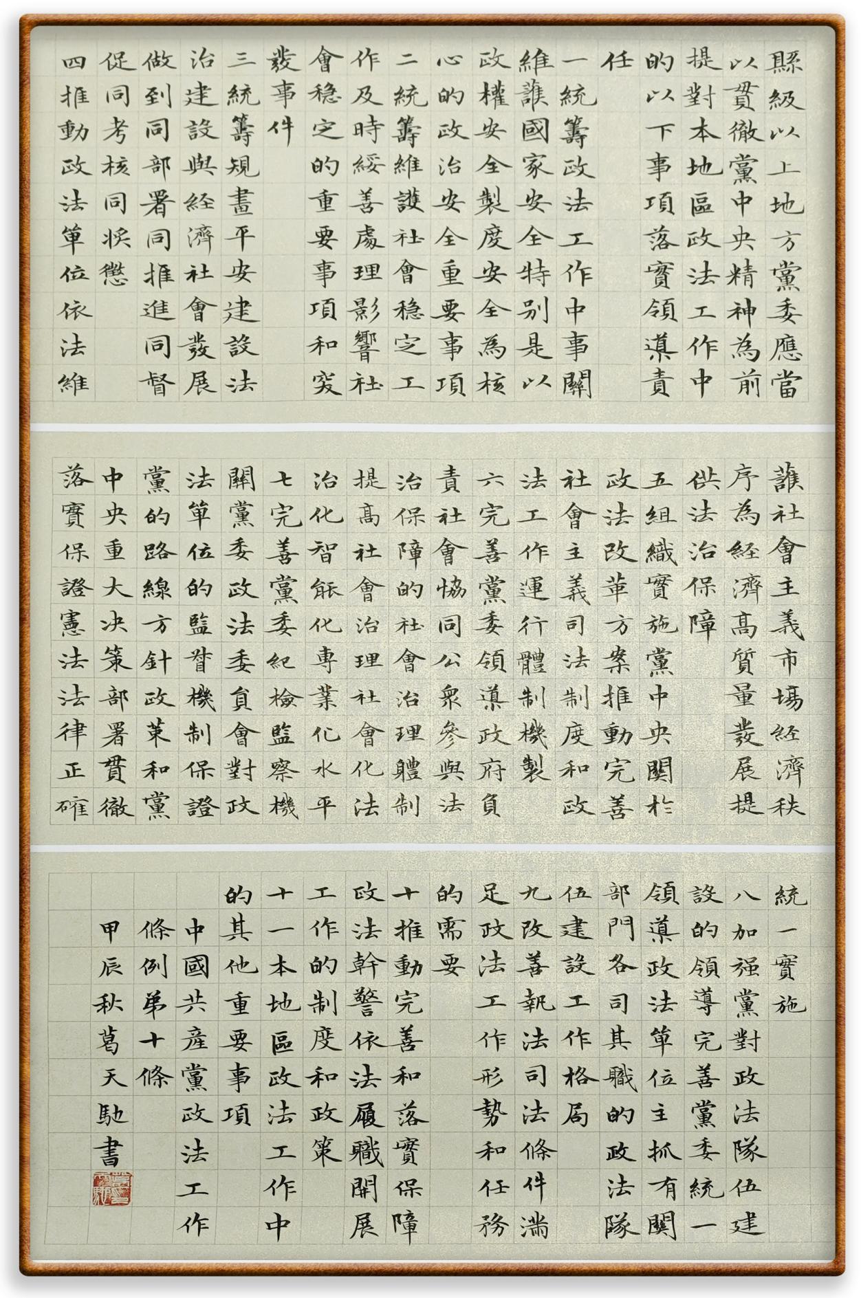 《中國共產(chǎn)黨政法工作條例》對黨領(lǐng)導(dǎo)新時(shí)代政法工作進(jìn)行全面制度擘畫,為黨領(lǐng)導(dǎo)政法工作提供基本遵循,具有重大而深遠(yuǎn)的意義。為學(xué)習(xí)好、宣傳好、貫徹好、實(shí)施好這部黨內(nèi)法規(guī),繼《中華人民共和國民法典》《中華人民共和國憲法》《信訪工作條例》《中華人民共和國澳門特別行政區(qū)基本法》《中華人民共和國香港特別行政區(qū)基本法》等法律法規(guī)之后,“書·法”系列活動將筆端對準(zhǔn)《中國共產(chǎn)黨政法工作條例》。