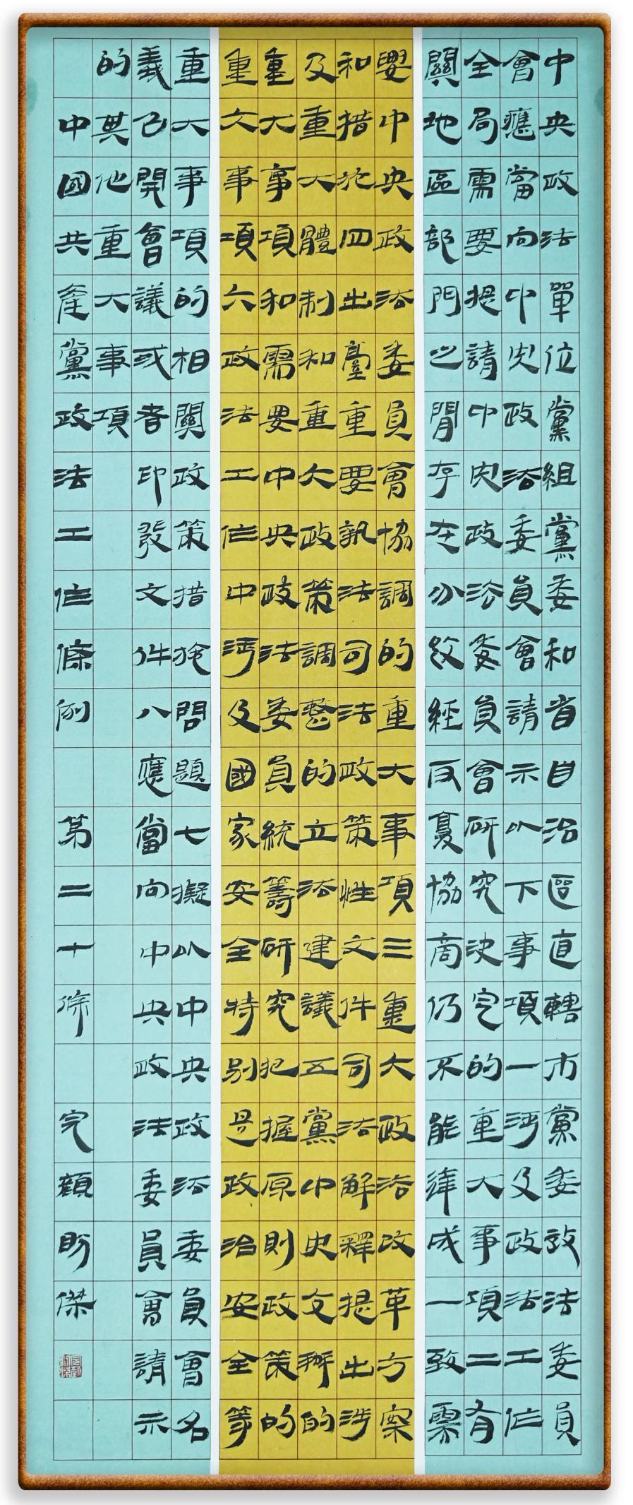 《中國共產黨政法工作條例》對黨領導新時代政法工作進行全面制度擘畫,為黨領導政法工作提供基本遵循,具有重大而深遠的意義。為學習好、宣傳好、貫徹好、實施好這部黨內法規(guī),繼《中華人民共和國民法典》《中華人民共和國憲法》《信訪工作條例》《中華人民共和國澳門特別行政區(qū)基本法》《中華人民共和國香港特別行政區(qū)基本法》等法律法規(guī)之后,“書·法”系列活動將筆端對準《中國共產黨政法工作條例》。
